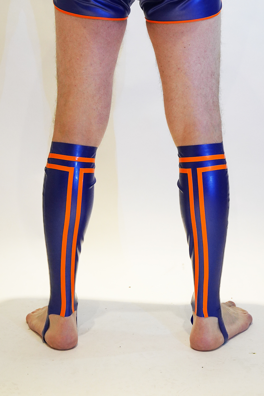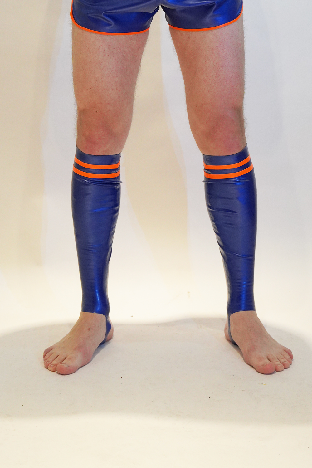 Gefertigt aus 0,4 mm Latexfolie, vereinen die „Barcelona“ ein sportliches Design mit klarer Szenepräsenz. Der integrierte Keilsteg sorgt für sicheren Sitz und dynamische Silhouette – inspiriert von klassischen Fußballstulpen, neu interpretiert in Latex.